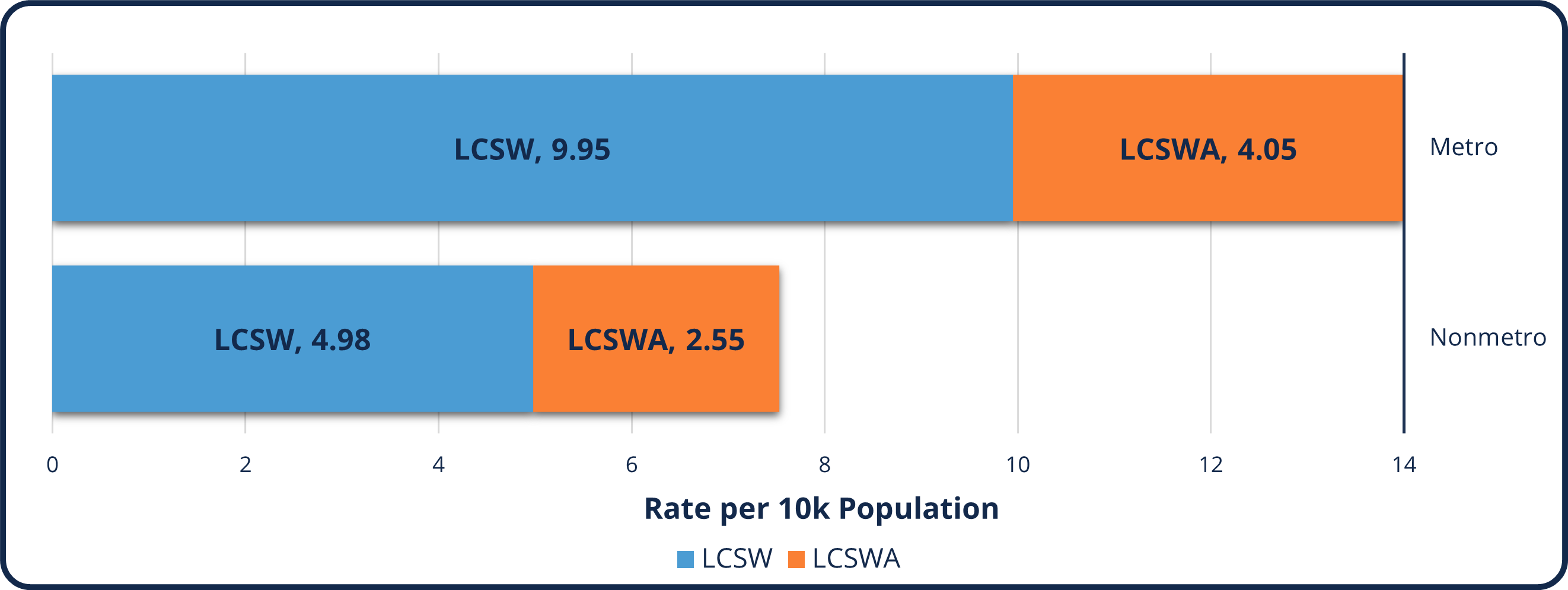 - Metro counties had nearly double the rate of LCSWs vs nonmetro areas: 9.95 vs 4.98 per 10k.
