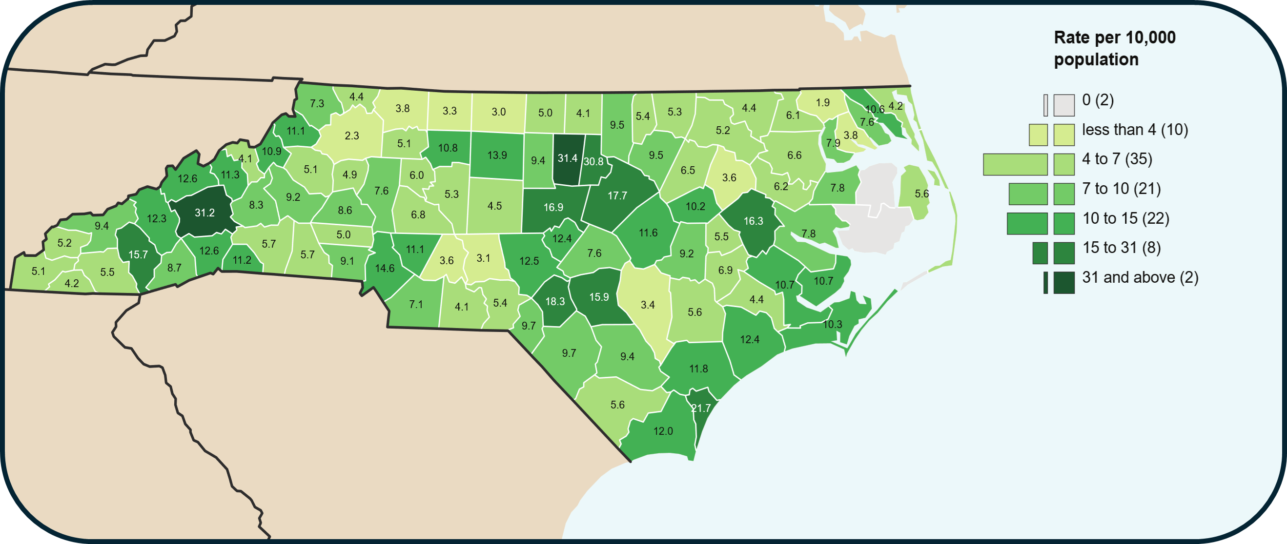 Licensed Social Workers per 10,000 Population by County, North Carolina, 2024